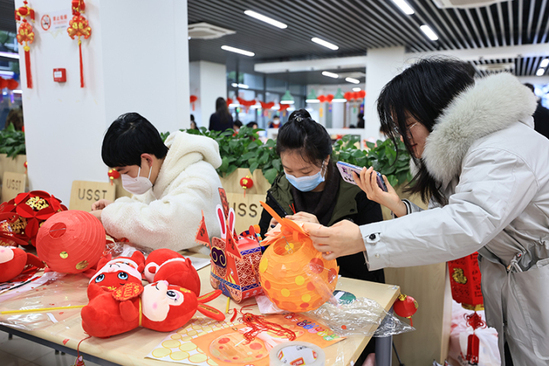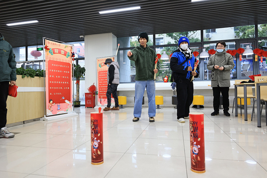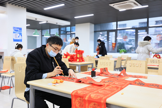 挥毫泼墨写就新春祝福,学生们亲自体验动手写一副春联,并把“福”字贴在宿舍门上;一盏盏红灯笼喜气洋洋,学生们看着自己亲手制作的灯笼成型时,乐在心头,喜在眉梢,兴高采烈地展示合影;大家还携手一起猜灯谜,并充满热情地参加投壶、滚铁环、踢毽子等年俗活动,毽子高飞、铁环翻滚,投壶小能手一个个百发百中,这些年味十足的民俗活动让师生们充分感受到了新春的氛围。“我因为实习原因留校,本来以为会很孤单,但参与到这样的活动中,我感受到了学校对留校学生的关心和关爱,同学们都玩得很开心。”来自上理光电信息与计算机工程学院的学生赵拓说。