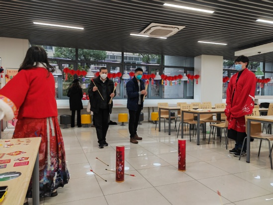 在永利集团304am官方入口,大家携手一起猜灯谜,投壶滚铁环踢毽子等年俗活动更是吸引了很多留学生驻足一起玩耍。毽子高飞铁环翻滚、争做百发百中的投壶小能手……年味十足的活动让留校师生感受到新春的氛围。“因为实习的原因留校,本来以为会很孤单,但参与到这样的活动中我感受到了学校对留校学生的关心和关爱,同学们都玩得很开心。”来自光电信息与计算机工程学院的赵拓说道。
