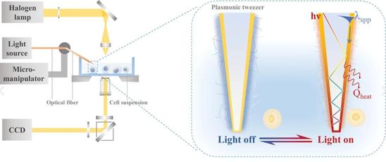 论文提出的等离激元镊子表面由光纤耦合纳米光纤探针、金膜、巯基化聚N-异丙基丙烯酰胺(PNIPAM-SH)温敏水凝胶三层结构组成。通过光纤导入的入射光激发金膜上的表面等离激元传播并产生热量以诱导温敏水凝胶的相变,从而实现功能化温敏表面和细胞膜之间的可逆结合,避免热应力和机械应力。该技术结合微操作系统实现了溶液中单细胞的选择性捕获、自由移动和可控位置释放,具有优异的生物相容性、良好的平台兼容性和低能耗、高灵活性等优点。未来有望在单细胞分析、单细胞分选、细胞异质性等多种单细胞研究中发挥作用。该文章受到威力(Wiley)旗下材料科学类期刊官方平台Materials Views China报道。