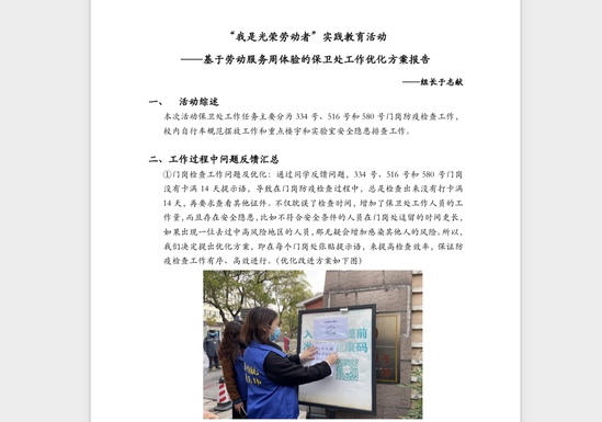 构建“4+X”劳动服务育人体系,与学校保卫处、后勤管理处、图书馆和公共试验中心四个部门结对,每年提供定量的劳动服务岗位,开展定向服务活动。“做+思”是劳动服务育人一个特色,在服务过程中思考问题的解决,主动贡献青年智力。来自机械学院的于志献面对服务中发现的问题,就提出了《基于劳动服务周体验的保卫处工作优化方案报告》,详细分析了存在的问题及解决对策,此案例也入选优秀劳动调研报告。