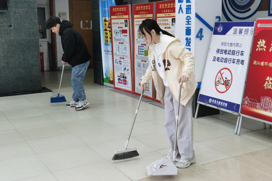 环建学院开展 “雷锋行动传校园,志愿服务漾人心”楼宇清扫活动,师生互助共同照亮环建家园。