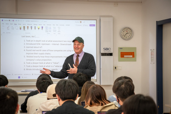 随后,日本师生代表团走进中英学院特色的英语教学课堂,与学院学生同上一堂全英文专业课。商科高级讲师 Tony Ryan以日本丰田汽车公司为例,结合市场营销的理论知识,为大家带来了一堂有趣生动的企业战略管理案例分析。日本学生认真听讲,积极参与课堂互动,课堂气氛轻松活跃。“能有机会深入英文课堂学习,我们都很高兴。课堂上老师和学生的热情让我们非常感动,我们也非常喜欢这种将理论与实践相结合的课程内容。”一位来自日本中央大学的学生说。