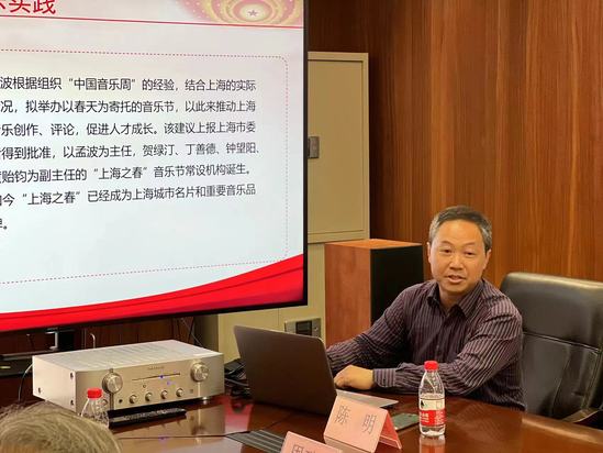 随后,上海音乐学院纪委委员、资产公司总支书记、总经理陈明以歌叙史、以乐化人,从红色基因在上音的传承发展、红色音乐实践、红色音乐的路径探索三个方面为大家讲述了一堂生动有趣、沁人心扉的音乐党课。