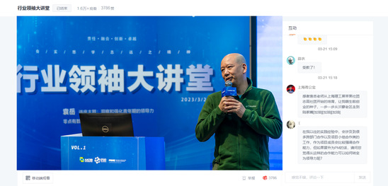 线上直播间同步参加行业大讲堂活动的老师、同学展现了高度的热情,1.6万多人次参与互动、点赞。此次活动交流不仅提升了师生们的批判性思维能力和行业认知,还有助于学生建立新的知识体系及能力架构,也助力管理学院贯彻落实科技兴国和人才强国战略,为社会发展培养更多复合型的管理精英。