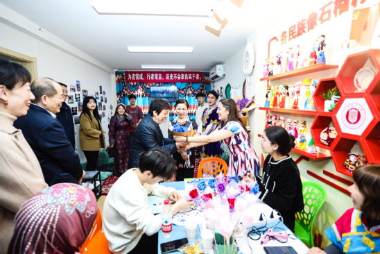 王珏一行实地走访了学校玛丽亚民族团结教育工作室(以下简称“工作室”),听取了玛丽亚老师代表学校汇报聚焦民族团结、加强民族交往交流交融方面的工作开展情况,观摩了杨浦区少数民族联合会与工作室牵手开展的区校联合民族团结主题日活动,包括民族手工艺品制作、民族乐器演奏、民族舞表演等。活动中王珏与在场少数民族学生亲切交流,关心学生在校学业发展、身心健康和生活情况,了解学校各民族学生依托工作室平台,交流互鉴民族文化、民族特色,感受民族魅力,共绘民族团结同心圆情况,现场气氛热烈融洽、笑声朗朗。