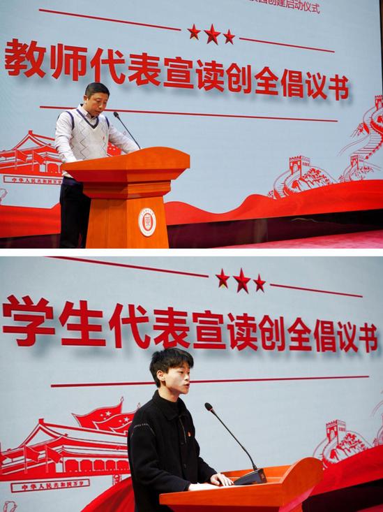 在铿锵有力的国歌中,创全仪式正式拉开序幕。李琴、卢萧、姚秀雯、艾连中,学院教师代表王成、学生代表黄鑫共同上台,启动健康学院全国文明校园创建活动。王成倡议教师加强师德师风建设,知行合一,与文明和谐共生,用实际行动做好学校文明代言人。黄鑫倡议同学们做文明校园的传播者,共同建设更加有底蕴、有活力的上理文明校园。随后,学院党委副书记孔夏萌为6名创全先锋队学生代表颁发聘书。创建全国文明校园是所有上理人的共同期盼,健康学院师生纷纷争当文明校园的宣传者、文明创建的践行者。