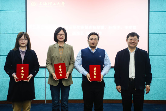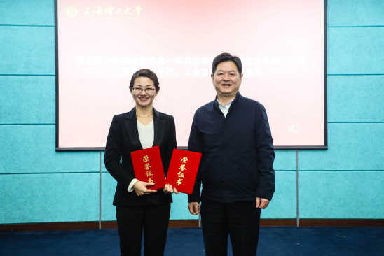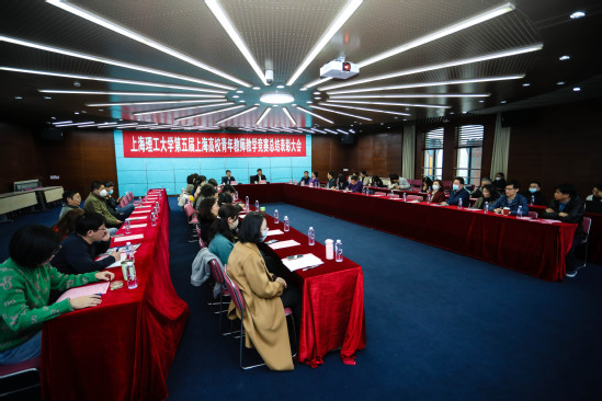 校工会常务副主席朱莉作为本届青教赛上理组委会代表介绍了本次比赛的相关情况。马克思主义学院青年教师、本届青教赛一等奖获得者王丽进行了现场教学展示。随后进行了表彰及授牌仪式,张华分别为本次青教赛优秀奖获得者郭湛达、焦古月颁发荣誉证书,三等奖获得者祝璇璇、孙明宇、李奕霖颁发荣誉证书。孙跃东分别为上海高校青教赛一等奖获得者、上海市教学能手王丽颁发荣誉证书,为本届青教赛优秀组织单位颁发第五届上海高校青教赛优秀组织奖奖牌。