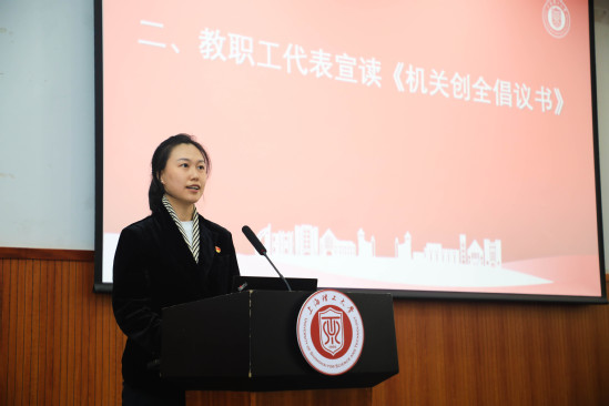 动员大会上,机关党委向全体机关教工发出创全倡议,党委组织部孙畅代表机关党委宣读倡议书。机关党委委员魏东和刁节文代表机关各部门围绕机关党委在创建全国文明校园的目标任务做表态发言,表示要结合部门工作实际和业务特点,切实提升管理能力和服务水平,助力学校取得全国文明校园建设和事业发展双丰收。