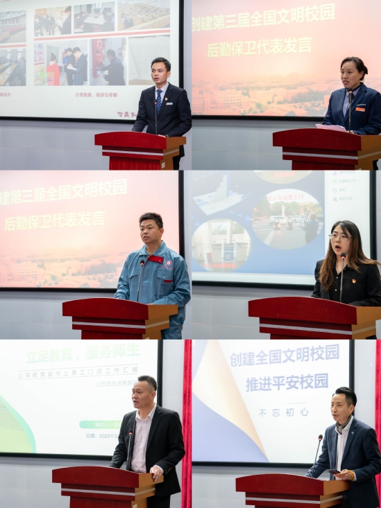 后勤管理处、保卫部(处)相关的物业公司、食堂、水电维修班组、快递中心、超市、安保公司等各组织代表,就决胜创建全国文明校园工作进行表态发言。创建全国文明校园是上理人的共同期盼,文明创建后保先行。各位代表承诺,后保人将立足每一个岗位,爱岗敬业,践行工匠精神,增强文明意识,树立文明观念,提升文明素养,展示文明形象,争做文明校园的宣传者和创造者。