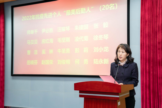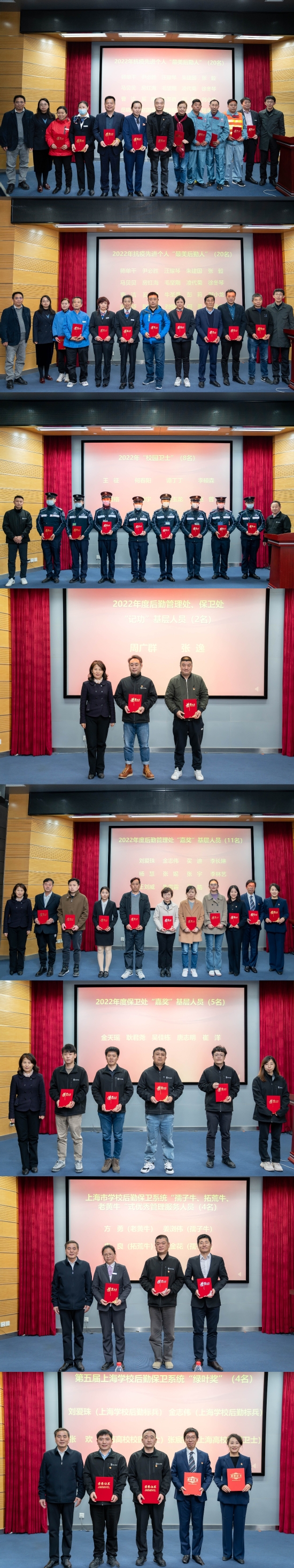 大会首先对后勤管理处、保卫部(处)遴选的2022年驻校服务单位抗疫先进个人“最美后勤人”“校园卫士”,2022 年度学校年终考核后勤保卫“嘉奖、记功”人员,2021年度上海市学校后勤保卫系统“孺子牛”“拓荒牛”“老黄牛”式优秀后保人员,以及2022年度上海市学校后勤保卫系统的绿叶奖“后勤标兵”“校园卫士”进行表彰。通过对先进个人的表彰,感谢后勤、保卫人员在抗疫工作中做出的贡献,并激发全体后勤保卫人以开拓创新、爱岗敬业的热情,积极投身于永利官网全国文明校园的创建工作中。