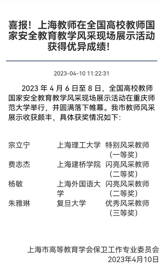 4月6日至8日,全国高校教师国家安全教育教学风采现场展示活动在重庆师范大学举行,马克思主义学院教师宗立宁代表学校参加此次活动,并获得特别风采教师一等奖。