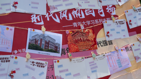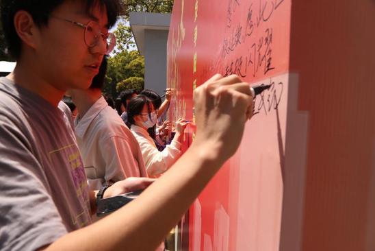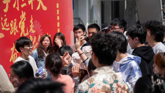 同学们在完成“青年大学习”线下打卡学习后可以在展板留言、合影留念。留言板设立在第四食堂门前,吸引了众多学生前来参与。红色的版面上坚挺有力的笔体书写着“学习二十大,永远跟党走,奋进新征程”,周围的空白部分被同学们对未来的美好畅想填满。活动结束后,“爱我中华”“星星之火,可以燎原”等寄托同学们美好祝愿的文字被记录在留言板上。日语2班的翟海琦同学表示:“学习新思想、争做新青年不只是口号,还应落实到行动,学习打卡和留言活动不仅让我们感受到良好的活动氛围,也是一次成功的思想教育实践,会更激励我们在未来的学习生活中踔厉奋发、勇毅前行。”