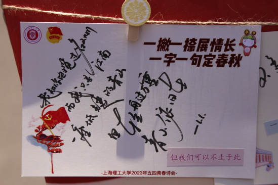 拼贴诗活动旨在希望同学们在明信片上用简短的词句拼贴出心中美好,随心而动。该活动广受欢迎,前来参与的同学络绎不绝,大家围在桌前从众多的素材中选取心仪的词、句,用青春隽永的小诗表达内心的美好愿景。拼贴诗活动打破传统诗词创作形式,是一次丰富学生情感的创新实践。电信8班的郭宸希同学在活动结束后意犹未尽,她表示:“拼贴诗活动是反映青年学生内心的情感表达,充满浓厚的文艺色彩,也在不知不觉中传递积极向上的青年风貌。”