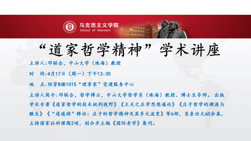 主讲人简介:邓联合,哲学博士,中山大学哲学系(珠海)教授、博士生导师。出版学术专著《道家哲学的技术批判视野》《王夫之庄学思想通论》《庄子哲学的渊源与酿生》《“逍遥游”释论:庄子的哲学精神及其多元流变》等6部,发表论文60余篇,主持国家社科课题2项,创办并主编《国际老学》集刊。