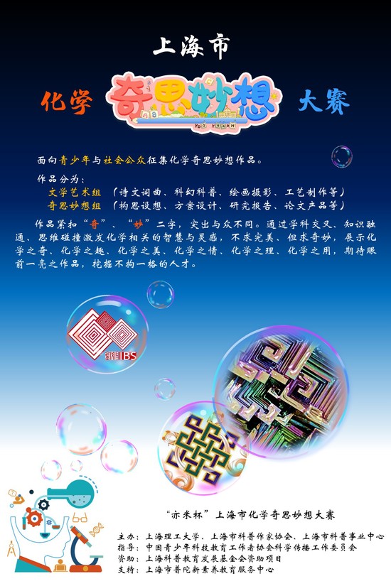 上海市化学奇思妙想大赛面向青少年与社会公众征集化学奇思妙想作品,旨在激发学生和公众对化学的兴趣和关注,培养创新意识和开放思维,塑造跨学科思维和全球化视野。结合系列科普讲座,让学生和社会公众了解化学和其他学科的关系、化学对人类文明发展的贡献,培养化学及科学相关的科技伦理和职业道德。