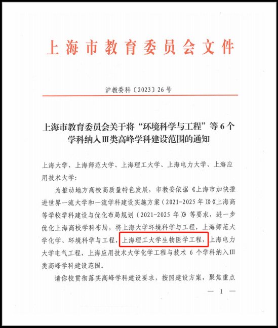 近日,上海市教委印发《上海市教育委员会关于将“环境科学与工程”等6个学科纳入Ⅲ类高峰学科建设范围的通知》(沪教委科〔2023〕26号),永利官网生物医学工程学科成功入选教委Ⅲ类高峰学科。