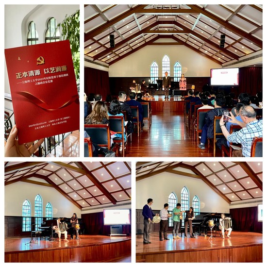 活动现场,上海音乐学院现代器乐与打击乐系朱政老师以“忆手风琴红色往昔”为题,以党的二十大报告提出的“全面从严治党体系”为主线,根据习近平总书记关于全面从严治党的一系列新思想新观点新论断,结合红色音乐理论概念、手风琴红色经典文化,分享了关于全面从严治党需要适应新时代新征程的形势任务、需要健全全面从严治党体系、需要系统化推进的心得感悟。上海音乐学院优秀师生代表以器乐作品、声乐作品等形式,带来《不忘初心》《草原上升起不落的太阳》《游击队之歌》《唱支山歌给党听》等一系列经典红色音乐作品,将党史、音乐史、文明交流史结合起来,把讲课、导赏与舞台表演融为一体。最后,音乐党课在全体合唱贺绿汀老院长创作的《廉政歌》的歌声中结束,既唱出了人民干部应尽的责任和担当,也唱出了人民对干部的期盼和要求。