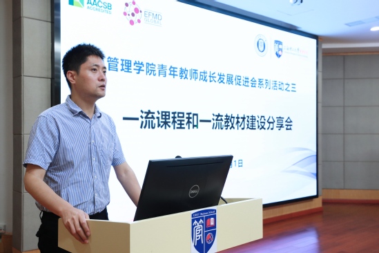 6月1日下午,管理学院青年教师成长发展促进会(以下简称:青促会)在经管大楼A楼四楼报告厅组织召开了青年教师一流课程和一流教材建设分享会。教务处副处长章国庆教授和管理学院叶春明教授主讲,管理学院副院长赵靖教授、青促会指导教师李正明教授以及学院全体青年教师参加分享会。会议由管理学院青促会会长刘勤明主持。