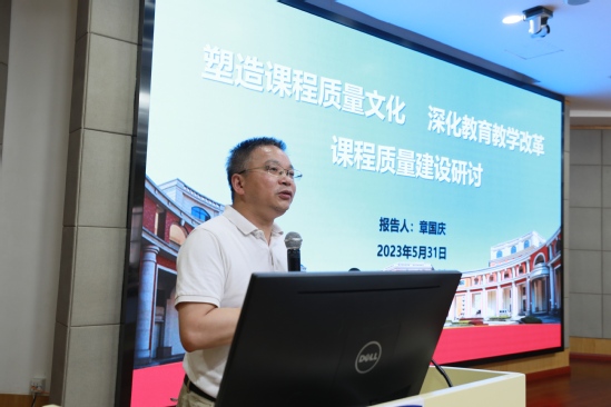 随后,章国庆以“立足学校人才培养目标,全面推进本科课程高质量发展”为主题,分享了当前学校一流课程和一流教材的总体情况、本科课程高质量发展要点、保障机制以及相关的工作任务安排。重点对课程质量文化建设、大思政课程建设、课程体系优化、教学方式改革、实践课程建设、完善课程考核体系以及课程教学团队建设七个方面进行了细致讲解。