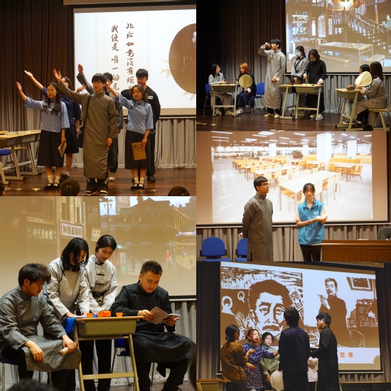 在课本剧演出中,参与演出的同学们以鲁迅经典文学作品为载体,进行剧目创作、排练排演、道具制作、场景布置等,通过与鲁迅及其笔下的人物进行精神对话,深化对鲁迅精神的理解。第一组同学所演绎的作品《祝福》表现了一个离开故乡的知识分子,见证封建文化压迫的祥林嫂猝死的悲剧。第二组同学的作品《药》讲述了迷信的华老栓夫妇为了救自己的儿子小栓买人血馒头治病的故事,揭露了长期的封建统治给人民造成的麻木和愚昧。第三组同学的《藤野先生》对鲁迅留学日本时期的生平进行演绎,生动再现了鲁迅先生在旧时代的呐喊,并选择弃医从文的人生重大转折。第四组同学的作品《孔乙己》演绎了鲁迅笔下那个饱受封建教育摧残的读书人,最终在人们冷漠的笑声中死去。最后一组同学们以原创作品《穿越时光的文豪》,在舞台上实现与穿越到新时代上理校园的鲁迅先生对话,演绎出鲁迅先生与新时代的中国青年之间的精彩故事。惟妙惟肖的表演、生动的人物演绎、独特的视角切入,赢得了现场师生的阵阵掌声。