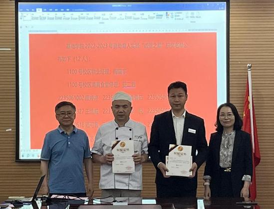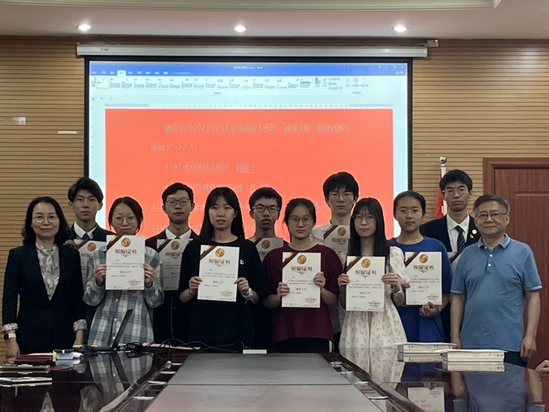 主持人张小荷公布了基础学院2022-2023学年“希望之星”“诚信之星”获奖学生名单后,曹英、马军山为获奖学生代表颁发了荣誉证书及奖品。