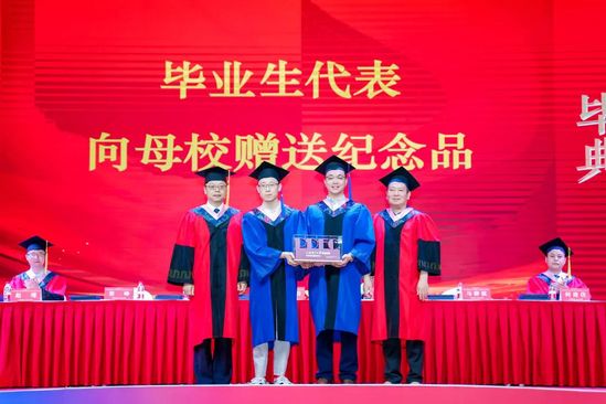 赵来军、马静波代表学校接受毕业生代表向母校赠送的纪念品——专业学位教育中心PDEC形象标识 。该标识将放置于南校区大草坪上,表达毕业生饮水思源,不忘母校培育之恩。