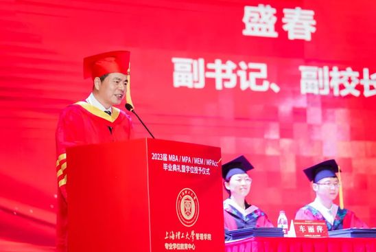 临别之际,盛春向毕业生们致以诚挚祝贺,毕业典礼是同学们接受上理“跨学科、重创新、贴行业”研究生教育历程中的重要里程碑,标志着同学们生命中一个章节的结束,也是另一个篇章的开始。希望同学们守正创新,知行合一,奔赴党和国家最需要的地方;秉持上理精神,勇往直前,凝聚力量,持之以恒,让长期奋斗成为贯穿青春韶华的主旋律。盛春激励同学们踔厉奋发,勇毅前行,把命运牢牢掌握在自己手中。
