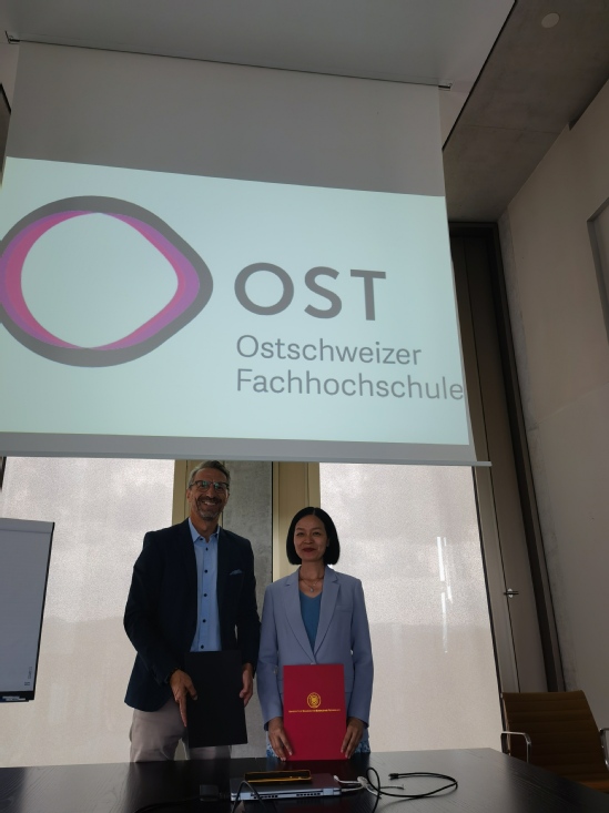 最后,代表团辗转瑞士苏黎世和圣加仑等地,访问了东瑞士应用科技大学及其分校。东瑞士应用科技大学是瑞士东部最大的应用科技类大学,并于2021年底将瑞士东部的圣加仑应用科技大学等三所高校合并完成了重组;永利集团304am官方入口的原合作高校圣加仑应用科技大学加入了东瑞士应用科技大学,成为了东瑞士应用科技大学圣加仑分校。东瑞士应用科技大学战略与发展部主任、原圣加仑应用科技大学副校长Sibylle Minder-Hochreutener教授,国际交流中心主任Karin Pfister,国际关系部主任Sigmar Willi教授以及市场战略研究所所长Sonia Lippe教授等参与接待了永利官网一行。Karin Pfister介绍了东瑞士应用科技大学圣加仑分校的近况,并希望和永利集团304am官方入口在学科共建、教师学生交流、暑期学校、海外实习等方面加深合作。双方签署了最新合作协议。