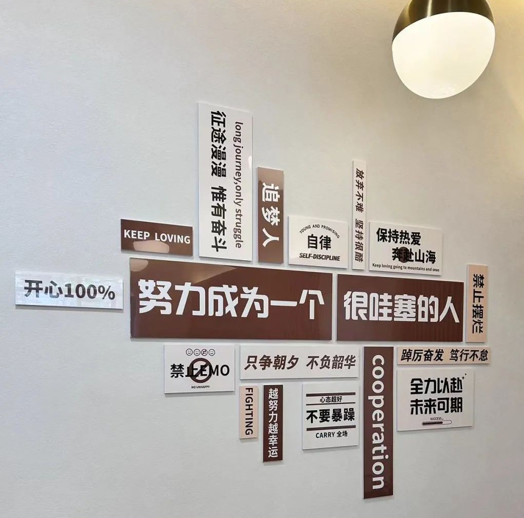 走进店内,65平方米的空间布置得很有文化气息,共设有20个座位,红色的书架上陈列着各色书目。相较于其他咖啡店,这里贴满励志的座右铭——“只争朝夕,不负韶华”“努力成为一个很哇噻的人”,放松治愈的同时充满了文化气息。