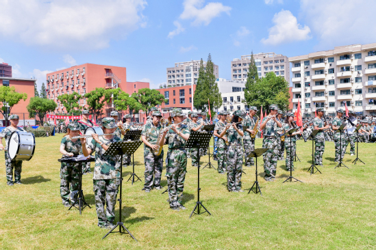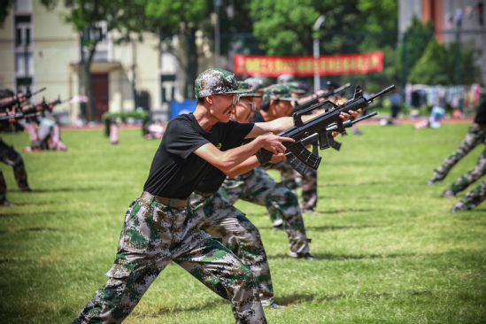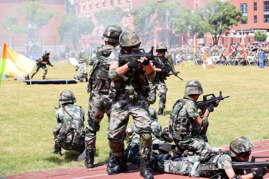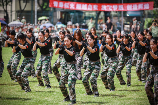 在军训会操表演环节,军乐队演奏、队列示范、刺杀操、女子匕首操、擒敌拳、应急棍术、警棍盾牌操、战术、武警教官摔擒项目等9个表演科目轮流展示,展现了不畏艰难、勇往直前的坚定信念,展现了过硬的军事素质与本领。