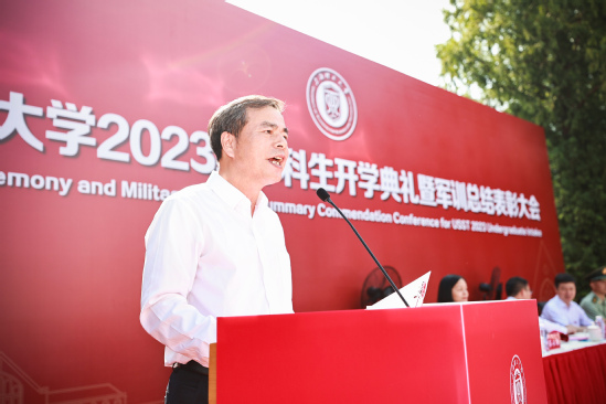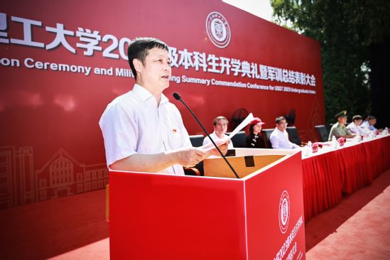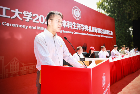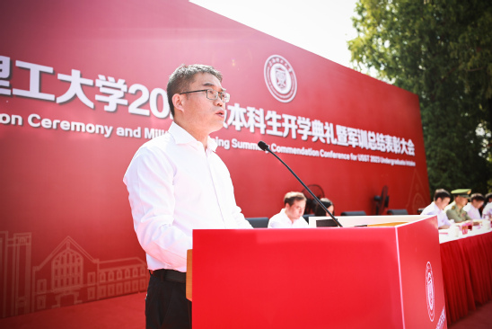 校长丁晓东以“未来工程人才,从上理出发”为题发表讲话,他向2023级新同学表示热烈欢迎,向辛劳付出的承训教官们表示衷心的感谢。他系统全面地向全体新生介绍了学校的发展文脉和校园文化,重点聚焦学校工程教育特色,阐述了学校卓越工程人才培养的目标。他希望同学们将个人发展与国家发展紧密结合起来,要从实践学习、协同学习、全面学习、智慧学习出发,聚焦于国家与社会需要,“把故事讲给社会听”。同时他殷切期望同学们要以上理人的务实精神,学会在“大工程”时代背景下,学会平衡、沟通、组织与管理,要将自己塑造成能够解决复杂工程问题的复合型创新人才。在人机深度融合的新图景徐徐展开的新时代,他勉励同学们主动思考“为什么而学、学成为怎样的人”这样的时代之问,要珍惜大学时光,铭记“信义勤爱 思学志远”的校训,传承“爱国图强、开放包容、敢为人先、追求卓越”的上理精神,享受基于工程的学习过程,掌握科学和技术,读懂社会与人生,成为灵性而有趣的人,成为气贯大世界的国之栋梁,勇担科技报国、制造强国、民族复兴的使命,为中国式现代化贡献青春力量。