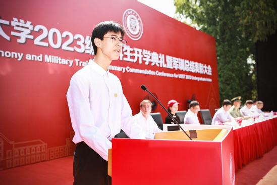 基础学院2023级本科生沈陈鹏举作为新生代表发言,他表示,历经高考与军训的洗礼,新上理人将在百年历史底蕴的沪江园中,不畏艰险、不惧挑战,切实躬身践行“信义勤爱 思学志远”的校训精神,承载着上理的希望与荣光。