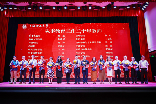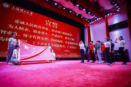 丁晓东宣读“30年教龄教师名单”,并为30年教龄教师颁发荣誉证书。30年教龄教师代表黄远东老师发言,他回顾了自己从教历程,与青年教师分享了关于教学、科研、育人方面的经验与感悟。沪江学院教师侯震一代表新进教师发言,她表示,教育工作者肩负着传播知识、传播真理,塑造灵魂、塑造新人的时代重任,作为新入职教师,愿在上理工的舞台上绽放光彩、实现梦想。获得2022年上海市“‘四有’好教师”(教书育人楷模)提名奖的顾铮天教授带领新进教师紧握右拳面向国旗进行庄严宣誓,表达了扎根教育事业,为党育人、为国育才的坚定决心。