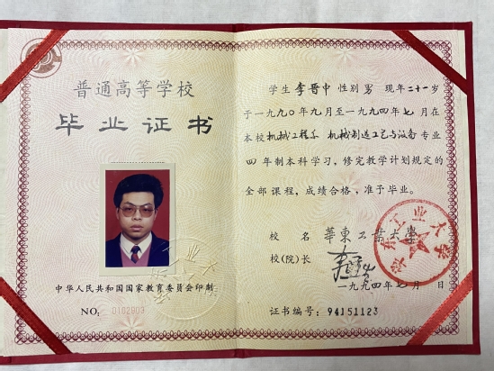 父亲李晋中的毕业证书,其入学时的校名还是“上海机械学院”(李千一供图)