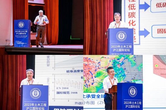 本次论坛瞄准行业的热点问题、前沿问题,为土木工程行业绿色高质量发展提供中国智慧与国际视野。中国科学院院士、同济大学孙钧教授畅想海上交通运输建设的伟大革命,并探讨了真空超导磁浮高速隧道工程的前期工作与运行方案,为如何实现海上交通运输建设提供了启发。日本工程院外籍院士、同济大学汪发武教授分享了2023年土耳其卡赫拉曼马拉什地震造成的损失分析,及其对中国双碳战略实现的启示。澳大利亚技术科学与工程院院士、新南威尔士大学Nasser Khalili教授围绕非饱和土力学展开主旨报告,为非饱和土力学的发展提供新思路。国际工程地质与环境协会前主席、德国亚琛工业大学Rafig Azzam教授围绕基于数据融合和数据挖掘的自组织滑坡监测传感器网络作主旨报告,开发的滑坡预警原型系统为提高滑坡预警准确性提供参考。东南大学岩土工程学科首席科学家刘松玉教授分享了岩土工程低碳化技术创新与应用,包括岩土工程智能化和岩土工程固碳技术等,实现了岩土工程有效碳利用,为土木工程学科践行“双碳”战略提供了新思路。国家杰出青年科学基金获得者、国家重点基础研究发展计划“973计划”青年首席科学家、同济大学科研管理部部长冯世进教授全面分析了滨海软土地层能源群桩热力相互作用机制,为地热能清洁能源补充供热技术和滨海岩土与工程地质发展提供参考。国家杰出青年科学基金获得者、教育部特聘教授、同济大学黄雨教授围绕土体大变形流动的时空演化规律、多相态转变的致灾机制、演化评估及灾害防治研究作分享报告。
