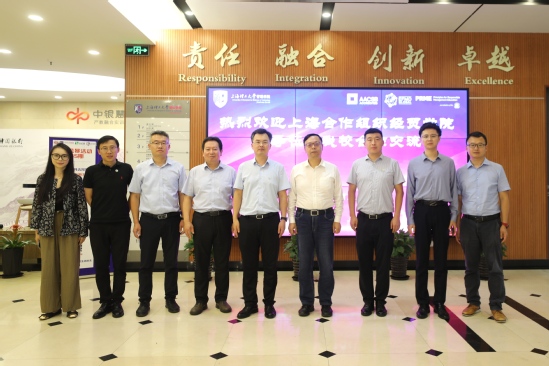 郑师介绍了中国—上海合作组织经贸学院建设情况,表示非常希望与上理深入合作,并诚挚邀请学校发挥学科及人才优势合作共建中国-上海合作组织经贸学院。陈超介绍了上合国际枢纽港情况,希望未来双方可以在产学研对接、成果转化、人才就业等方面加强合作。蒋公宝介绍了首届全国大学生职业规划大赛情况及设立管理学院胧爱奖学金方案。