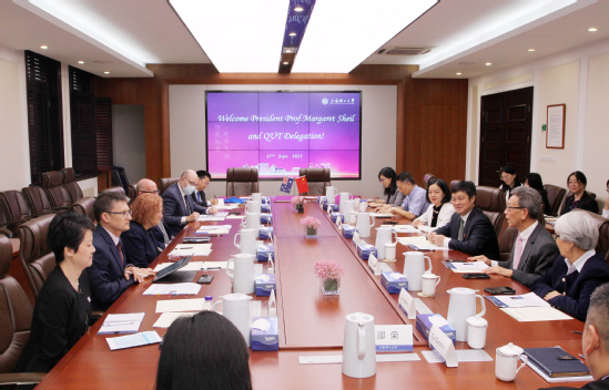 9月27日上午,澳大利亚昆士兰科技大学(Queensland University of Technology, QUT)校长谢镁俐(Margaret Sheil) 教授、副校长Scott Sheppard教授率领代表团一行6人访问永利集团304am官方入口。校长丁晓东在思晏堂201会议室会见了来宾。能源材料科学研究院院长窦世学院士、首席科学家刘化鹍院士,党校办、科研院、研究生院、国际交流处、能源材料科学研究院相关人员与会。会议由副校长蔡永莲主持。