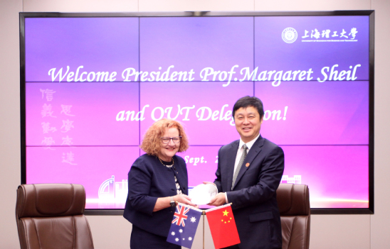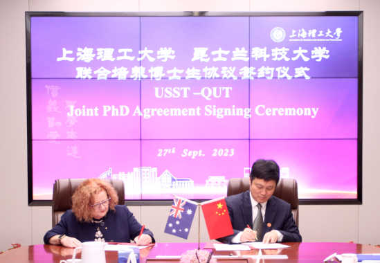 会上,双方签署两校联合培养博士生协议,共同培养高水平人才。随后,昆士兰科技大学校长代表团一行实地走访能源材料科学研究院,与研究院师生亲切交流,就筹建USST-QUT联合研究中心的可行性等方面开展了深入交流。