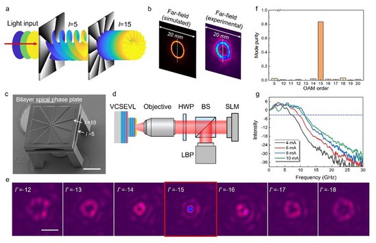 本研究中,作者提出了一种基于激光纳米三维(3D)打印集成轨道角动量相位结构的垂直腔面发射涡旋光激光器,具有体积小、高速度、低阈值、圆形光场、垂直出光、可阵列化的优势。作者通过激光打印微型的轨道角动量相位结构集成在垂直腔面发射激光器表面,从而使激光器发出的高斯光束经过相位结构的调制后变为涡旋光束。激光打印的方法可以扩大轨道角动量相位结构有效光照面积,从而可增大空间带宽积。同时,激光3D打印比此前方法具有较高的制造效率,单个器件的打印仅约为20分钟,而此前方法约为数小时。文章中,作者实现了拓扑荷数从1到5的可寻址涡旋光激光器阵列,单个器件尺寸仅约为100微米×100微米。