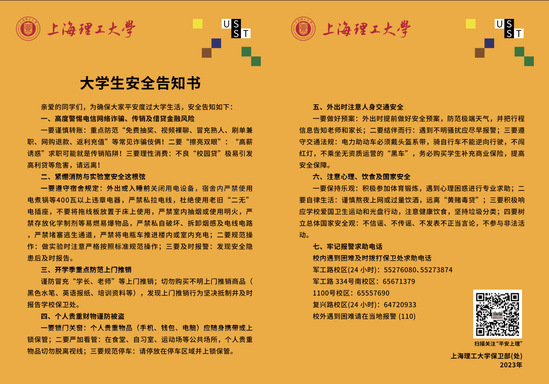 保卫处紧抓新生入学关键节点提前谋划,与属地派出所、消防支队等联合制作《大学生安全告知书》,附于近7000名新生的录取通知书材料中,使新生树立安全理念,提高防范意识。告知书内容涵盖国家安全、防范诈骗、交通安全、宿舍用电安全等十项内容,对大学生校园生活方方面面的安全注意事项作全面提示。“平安上理”微信公众号、校内电子宣传栏等提前发布相关安全提示;制作安全提示PPT发放至各学院,作为新生入学认知教育必修内容。保卫处还开设面向大一学生的“大学生公共安全教育”课程,发挥第一课堂主阵地作用,构建“三个课堂”安全教育阵地体系,全面做好安全育人,全方位营造校园安全文化氛围。