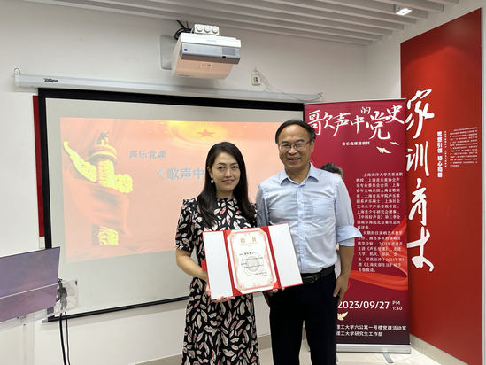 徐玉萍主讲的“歌声中的党史”,以党史为脉络,以音乐为载体,以党的百年历程为主线,串联起了“救国篇”“建国篇”“富国篇”“强国篇”四部分,重点选取了《义勇军进行曲》《没有共产党就没有新中国》《歌唱祖国》《唱支山歌给党听》《在希望的田野上》《春天的故事》《走进新时代》《共筑中国梦》《不忘初心》等不同时期、不同特征独具代表性的16首声乐作品,通过主题宣讲、歌曲演唱、音乐聆听和互动教(带)唱等方式,将理论学习、作品赏析与现场演绎有机结合,带领大家追忆了党筚路蓝缕、波澜壮阔的百年历程,感受党历久弥坚、砥砺前行的百年初心,在流淌着的歌声中学党史、感党恩、听党话、跟党走,以百年党史激励学生党员牢记初心使命,守正出新,砥砺奋进,激励学生党员、入党积极分子为推进强国建设、民族复兴作出贡献。