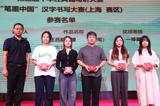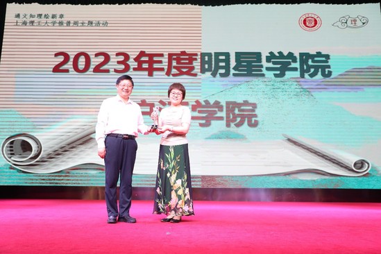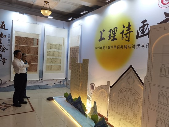 首届“通文知理绘新章·上理诗画夜”展演晚会创新呈现方式,围绕第26届推普主题“推广普通话,奋进新征程”,坚定推行国家通用语言文字教育,筑牢中华民族共同体意识。一方面,将今年学校在第五届中华经典诵写讲大赛(上海赛区)中获奖的优秀作品进行现场展演;另一方面,对2023年度在学校语言文字工作做出特别贡献的沪江学院颁发“明星学院”奖杯进行表彰。此外,晚会现场宣布成立上理“同音”推普服务志愿队,10名各民族大学生推普志愿者通过“家乡推普志愿活动”,以专业所长融合推普实践,将推普工作走出学校,走进家乡,走进社区。晚会当天,大礼堂二楼中厅华丽变身为书法展示厅,将参加“笔墨中国”汉字书写大赛的书法作品一一展出,师生们纷纷驻足欣赏。