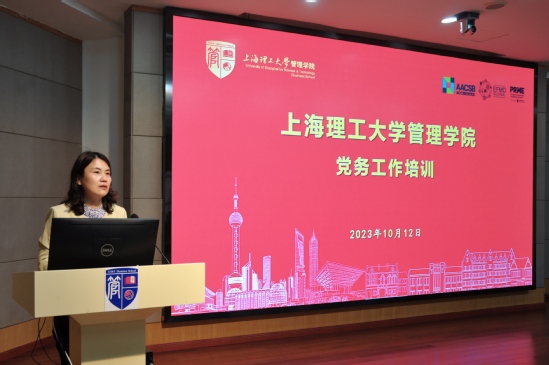 为全面提升基层党建工作质量,提升基层党支部书记党务工作能力,10月12日下午,管理学院党委举行“支部共建聚合力,追求卓越谱新篇”支部书记党务工作质量提升培训会,校党委组织部曹军,”教育部第三批全国党建工作样板支部“、上海市教卫系统”党支部建设示范点“机械学院机械制造党支部书记袁静,上海市优秀党务工作者、环境与建筑学院土木工程系教工党支部书记李秀君,上海高校”百个学生样板党支部“光电学院光学工程(学硕)研究生党支部书记华昕怡应邀出席会议,学院组织员、全体党支部书记、支部委员共60余人参加本次培训会议,会议由学院党委副书记蒲莹莹主持。