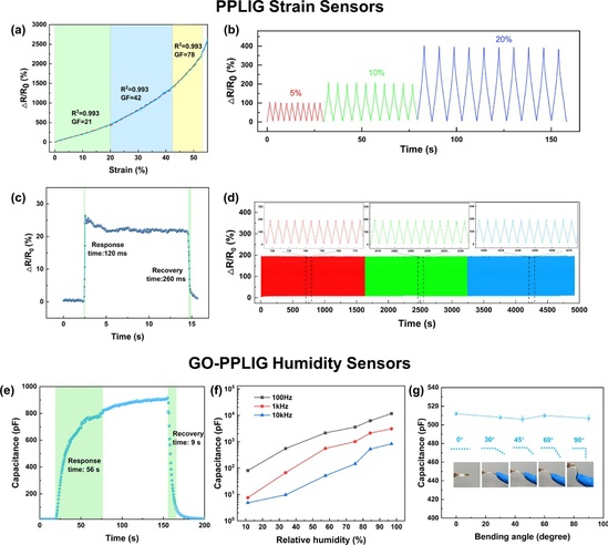 当该柔性应变传感器被固定在身体不同部位时,它能够实时监测手指、手腕、手肘的动作以及手腕桡动脉的脉搏;此外,该柔性湿度传感器可用于人体呼吸监测与非接触式传感。总之,通过激光诱导石墨烯在柔性复合薄膜上制备柔性电极的方法可实现大规模个性化定制,在柔性电子与可穿戴设备中具有非常广阔的应用前景。