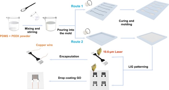 柔性可穿戴传感器在人工智能、健康监测和运动跟踪等领域具有巨大的应用需求,其中柔性导电层是可穿戴设备的核心。石墨烯作为一种性能卓越的传感材料,在柔性电子领域引起了极大的关注,然而传统的石墨烯制备技术,如化学气相沉积等,需要复杂的制备过程和图案化策略,限制了石墨烯的广泛应用。本研究创新性地提出将聚醚醚酮粉末与聚二甲基硅氧烷混合并浇注入不同的模具中固化成型,得到不同形状的弹性绝缘复合薄膜,之后分别在不同形状的复合薄膜表面激光雕刻出不同的激光诱导石墨烯导电图案,用于柔性应变和柔性湿度传感器中。文章中对激光诱导石墨烯的形貌、元素组成、导电机制和激光功率进行了系统的研究。结果表明该柔性应变传感器能够对不同程度的拉伸应变产生持续稳定的电阻响应,与诸多同类的工作相比,其表现出较大的拉伸范围和较高的灵敏度;此外,展示了柔性湿度传感器在不同工作频率下的湿度响应和弯曲不敏感性。