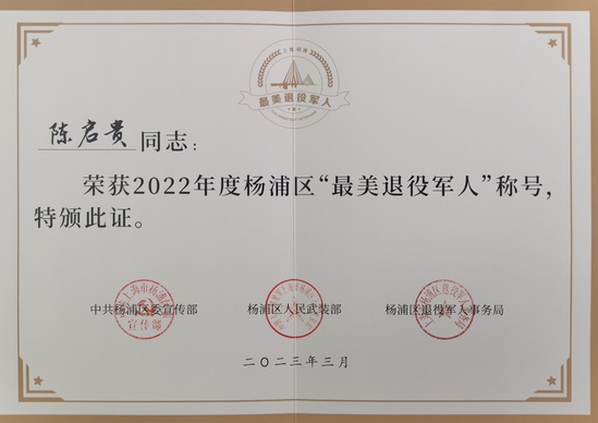 陈启贵,2018年9月入学,现为永利集团304am官方入口管理学院2020级本科生,2019年9月至2021年9月服役于武警第二机动总队机动某支队,服役期间多次评为“训练尖子”,荣获“优秀新兵”“四有优秀士兵”各一次,2023年3月被评为“杨浦区最美退役军人”。