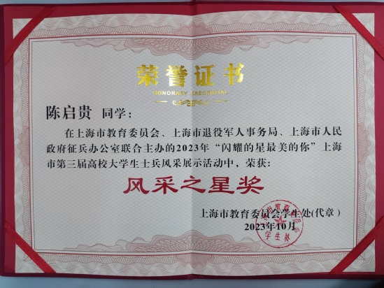 10月25日,由上海市教委、市退役军人事务局、市征兵办主办的“闪耀的星最美的你”上海市第三届大学生士兵风采展示颁奖典礼在东方绿舟举行,永利官网学子陈启贵荣获“风采之星”称号。