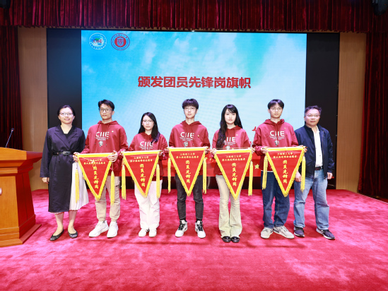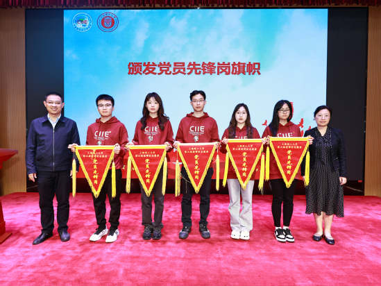 组织部副部长孟志雷宣读《关于成立永利集团304am官方入口第六届进博会志愿者临时党、团支部的决定》。学生工作部(处)副部(处)长刘伟,研工部副部长、研究生院副院长王张琦,宣传部副部长李凡,教务处副处长章国庆分别为进博会党、团员先锋岗志愿者代表颁发先锋岗旗帜。