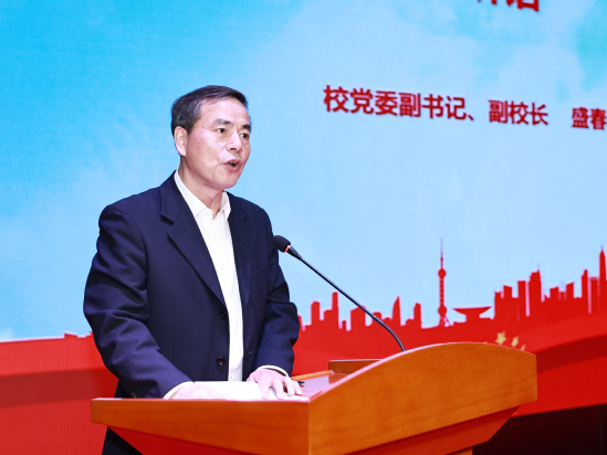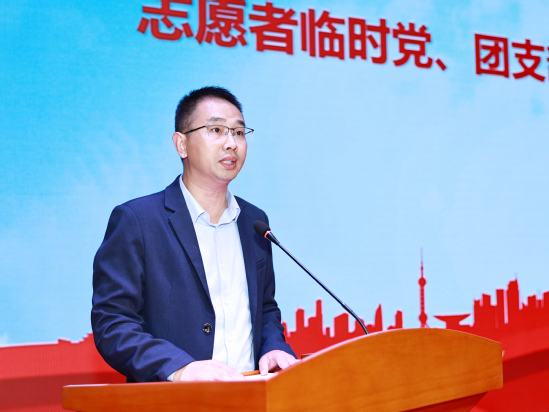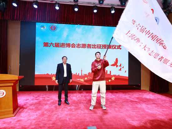 盛春为即将出征的志愿者授旗并做动员讲话。他代表学校党委向服务进博会、保障进博会的“小叶子”们和老师们表示衷心的感谢和诚挚的问候。他指出,参与进博会的志愿服务,是党和国家交给我们的重要政治任务,也是上理青年向世界展示家国情怀和使命担当的重要契机。他对上理“小叶子”们提出了三点希望:一是追求卓越,把志愿服务做到细心贴心暖心,延续上理青年志愿服务品牌,展现新时代上理青年的精神风貌。二是攻坚克难,提升自身综合素质,加强岗位实战能力和应急处置能力,锤炼素质过硬的品格修养。三是学思践悟,自觉将志愿服务与未来成长结合,将个人规划与投身社会主义现代化建设结合,讲好青春与进博同行、与志愿同行的故事,激发奋发向上的内生力量。同时,他也预祝同学们在进博会的舞台上,用青春与活力、热情与汗水、实力与担当以及饱满的精神状态和优质的志愿服务,赢得社会各方的高度肯定,展示新时代上理青年的良好形象,成为进博会上一道亮丽的风景线。