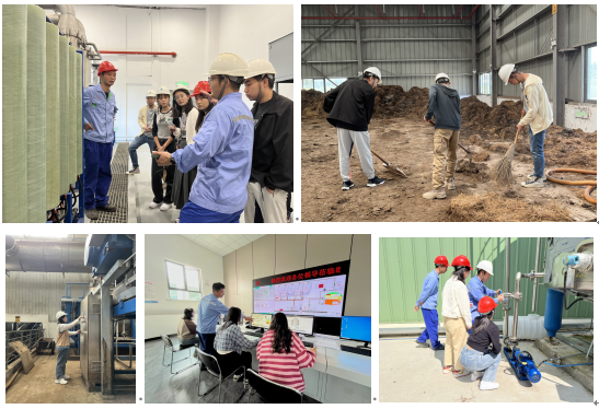 在公司技术负责人的带领下,团队首先来到上海崇明农业废弃物资源化综合利用项目现场,对利用种养废弃物进行沼气发电和生产有机肥的核心工艺进行了整体学习,该项目的核心工艺采用了瑞士 “车库式”干式厌氧发酵技术,可处理猪粪73,000 吨/年,处理秸秆31,000 吨/年,年发电量506.4万kW·h/年,年产有机肥30,000吨,每年减少向大气排放温室气体30122t(折合CO2)。随后,同学们在厌氧储料仓、秸秆的整理与传送带及中央控制室中,在值班工人的带领下分组进行了劳动实践,通过对室外压力泵系统的读数与操作方法以及超滤膜、反渗透装置的动手操作,在“带味儿”和“带劲儿”的劳动体验中,同学们对厌氧发酵工艺和全自动机械化系统有了更加深入的理解。